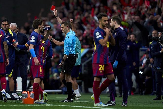 两回合较量,巴萨都有球员被红牌罚下,首回合库巴西的红牌被一些人认为处罚过重,此役的焦点则集中在第40分钟,奥尔莫在禁区内被略伦特推倒,但裁判没有判罚点球,值得一提的是,当时主裁判蒂尔潘回看了VAR,认为情节够不上点球判罚。此外,上半时费尔明被马竞门将穆索禁区内踢中面部,前裁判奥利弗认为,这也是一个点球,不过慢镜头回放显示,费尔明在不受干扰的情况下已经完成打门。